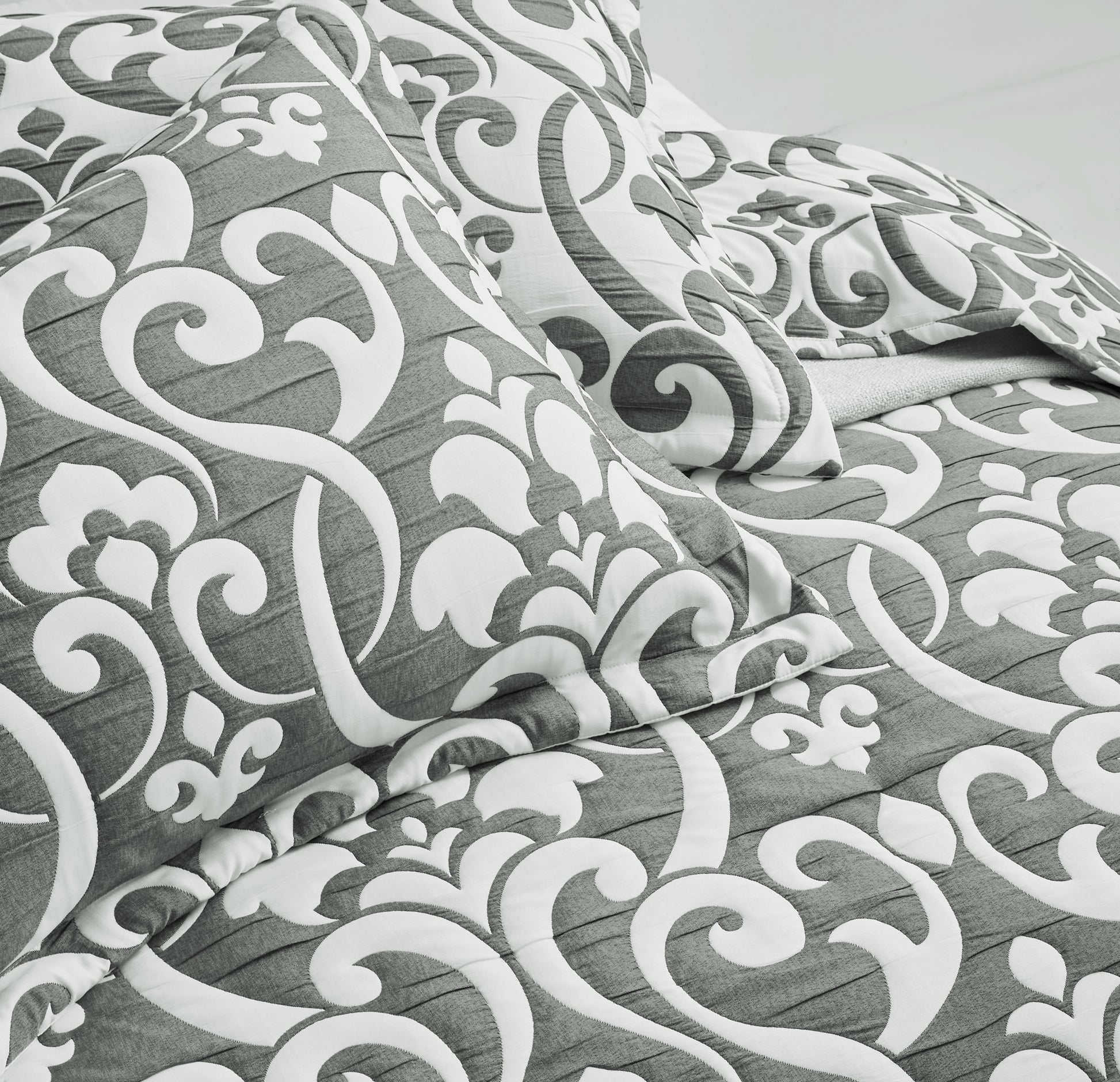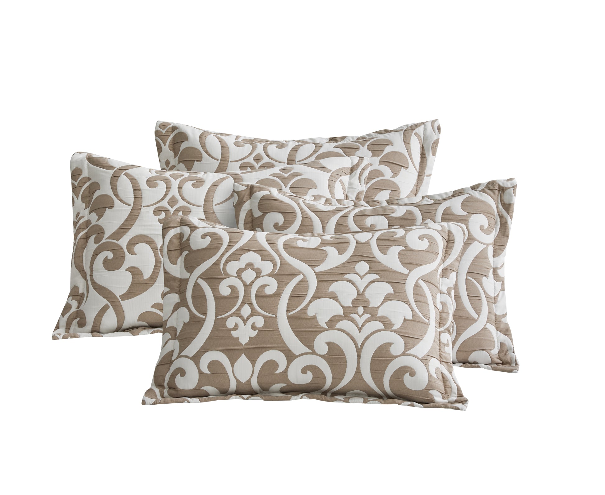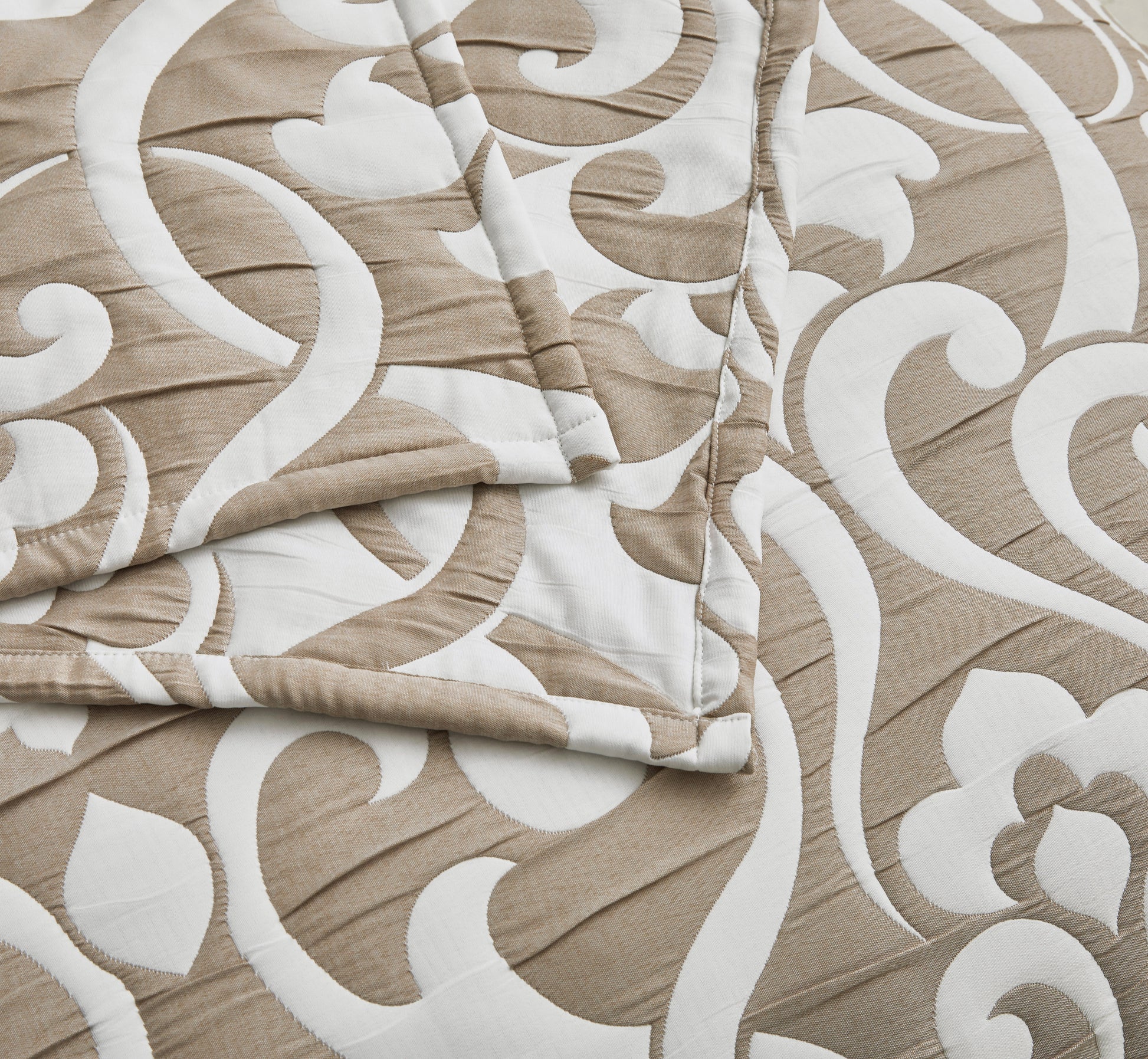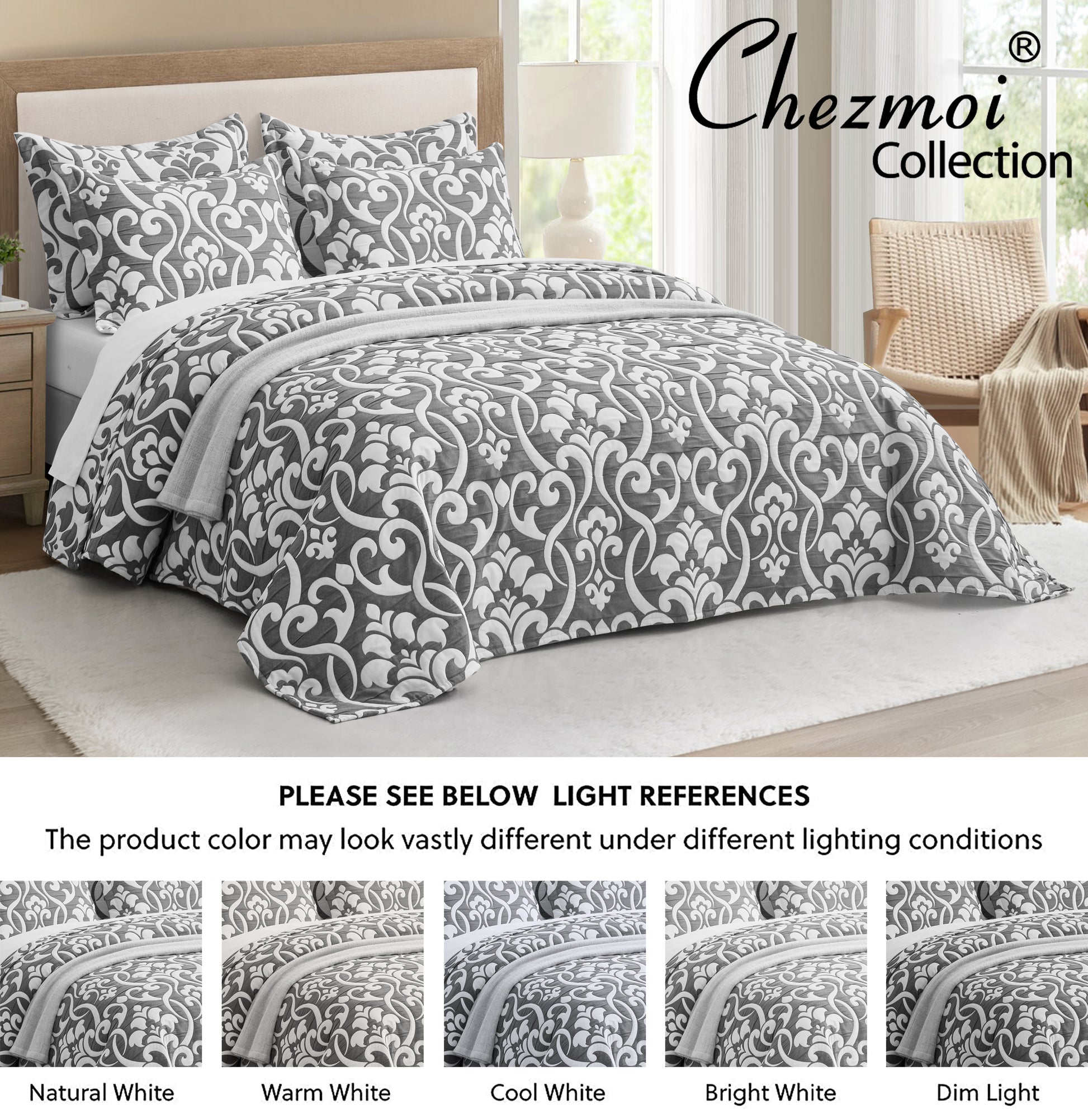 Elevate your bedroom with the Chezmoi Collection 5-Piece Oversized Jacquard Matelassé Bedspread Set. Designed with refined sophistication, this bedding set features a woven damask pattern in a subtle jacquard matelassé texture, creating a soft quilted look that blends classic elegance with modern comfort. A reversible option with one side featuring a rich tone for a dramatic look, while the reverse shows a softer palette for a brighter atmosphere. This oversized coverlet drapes beautifully over your bed, offering enhanced coverage to fit today’s deeper mattresses. The matelassé construction provides a lightweight, breathable layer that's ideal for warm seasons and perfect for layering in colder weather. Matching four pillow shams complete the ensemble with a seamless, upscale look. Made from durable and easy-care polyester, this set resists fading and shrinkage, staying looking fresh after every wash. Whether you're refreshing your master suite or updating a guest room, this damask bedspread adds a touch of sophistication to any space.