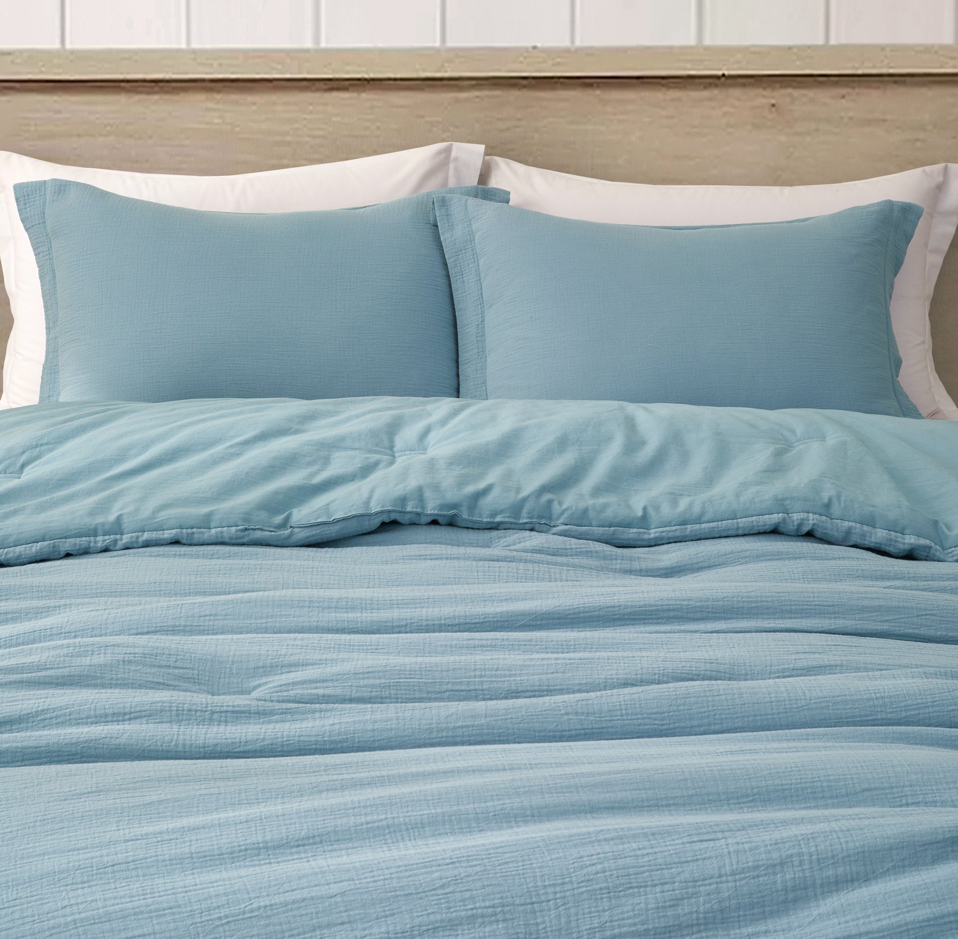Transform your bedroom into a cozy haven with our Luxurious Breeze Cotton Muslin Comforter Set. Designed for ultimate comfort and style, this set features a comforter and matching pillow shams crafted with meticulous attention to detail. The front of the comforter is made from a 100% cotton muslin fabric, offering a unique loose weave texture and a soft, airy feel. It's soft and cozy like sleeping on a cloud. The back is constructed from washed cotton fabric, providing a smooth and gentle touch against your skin. Filled with 240gsm polyester, this comforter delivers perfect warmth and coziness for year-round use. Available in a soothing soft hues, this set effortlessly complements any bedroom décor. Elevate your sleep experience with this premium comforter set, designed to provide unparalleled comfort and timeless elegance.