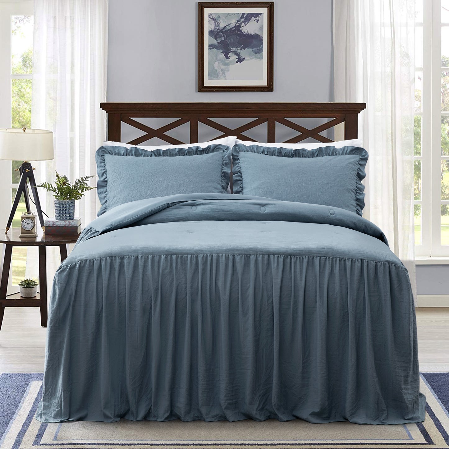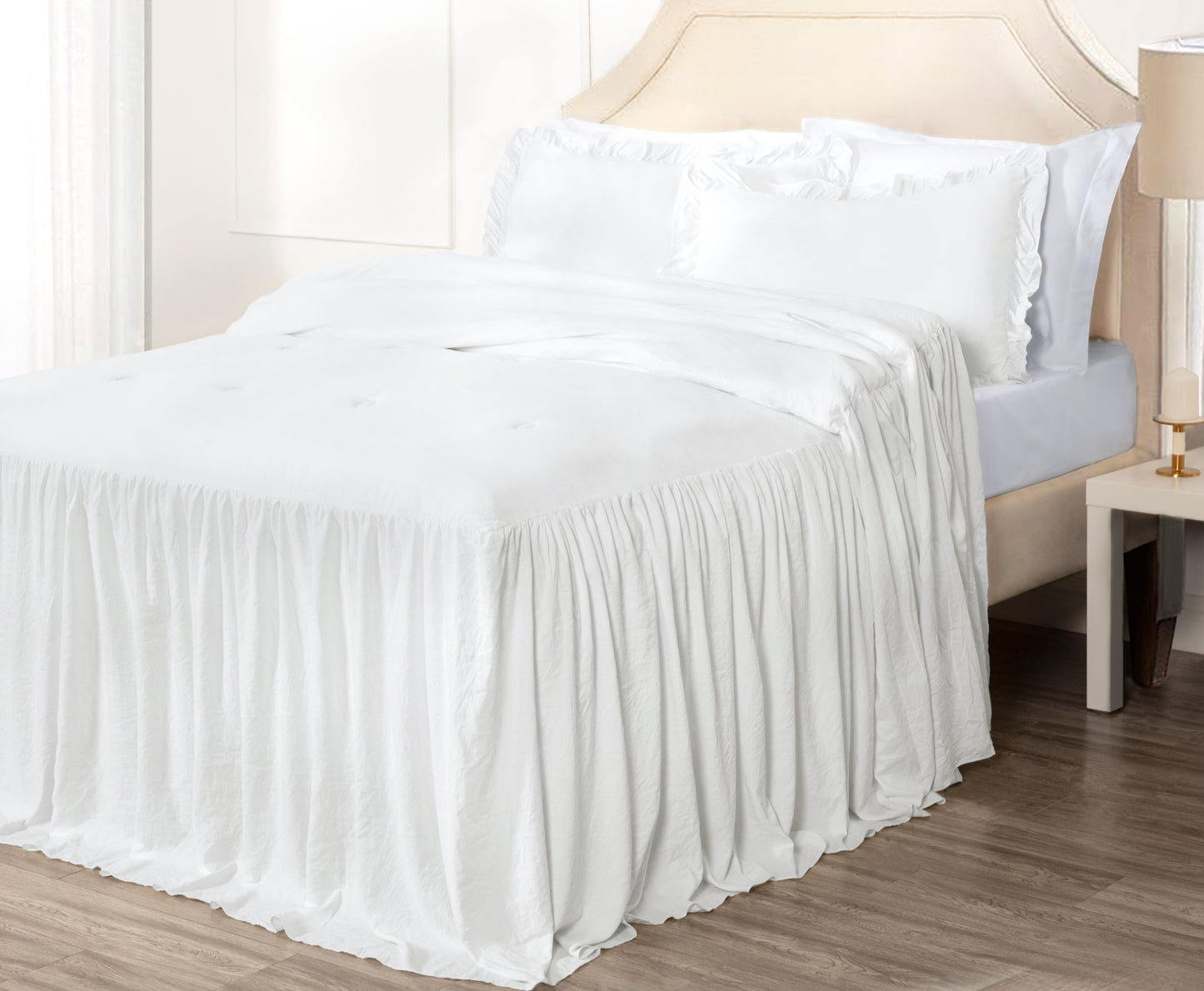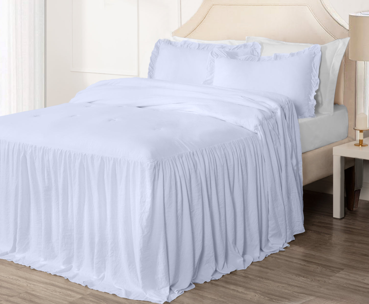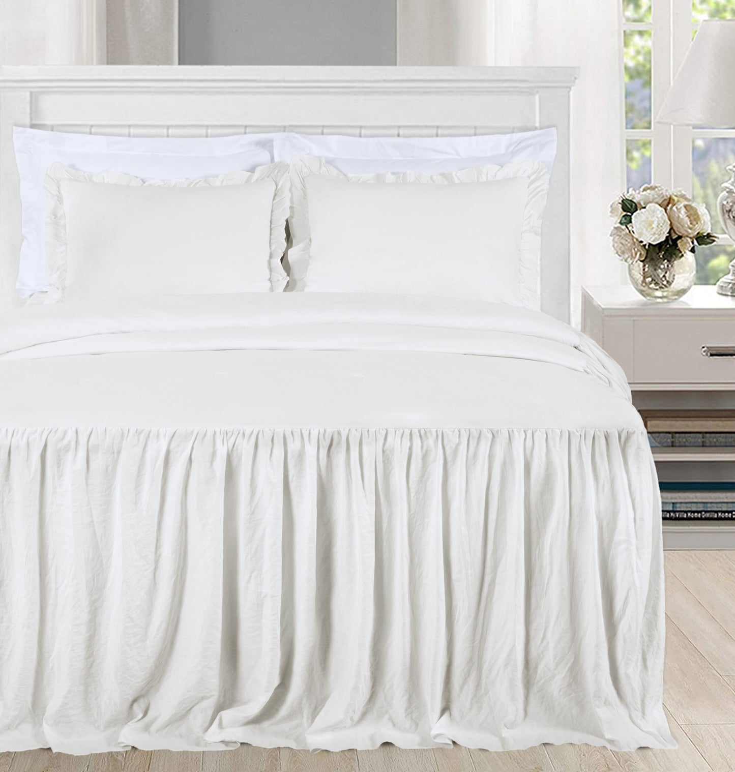 - Gorgeous and elegant feminine bedspread with a long ruffle skirt drop to add a perfect complement to a French Country farmhouse style bedroom décor