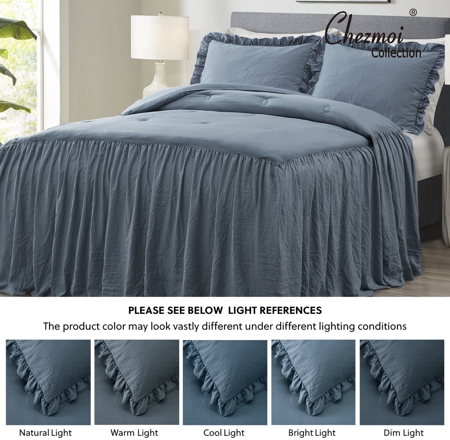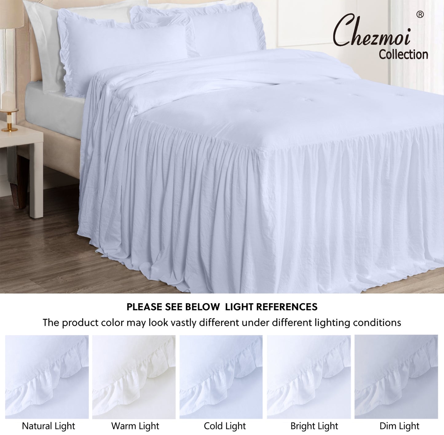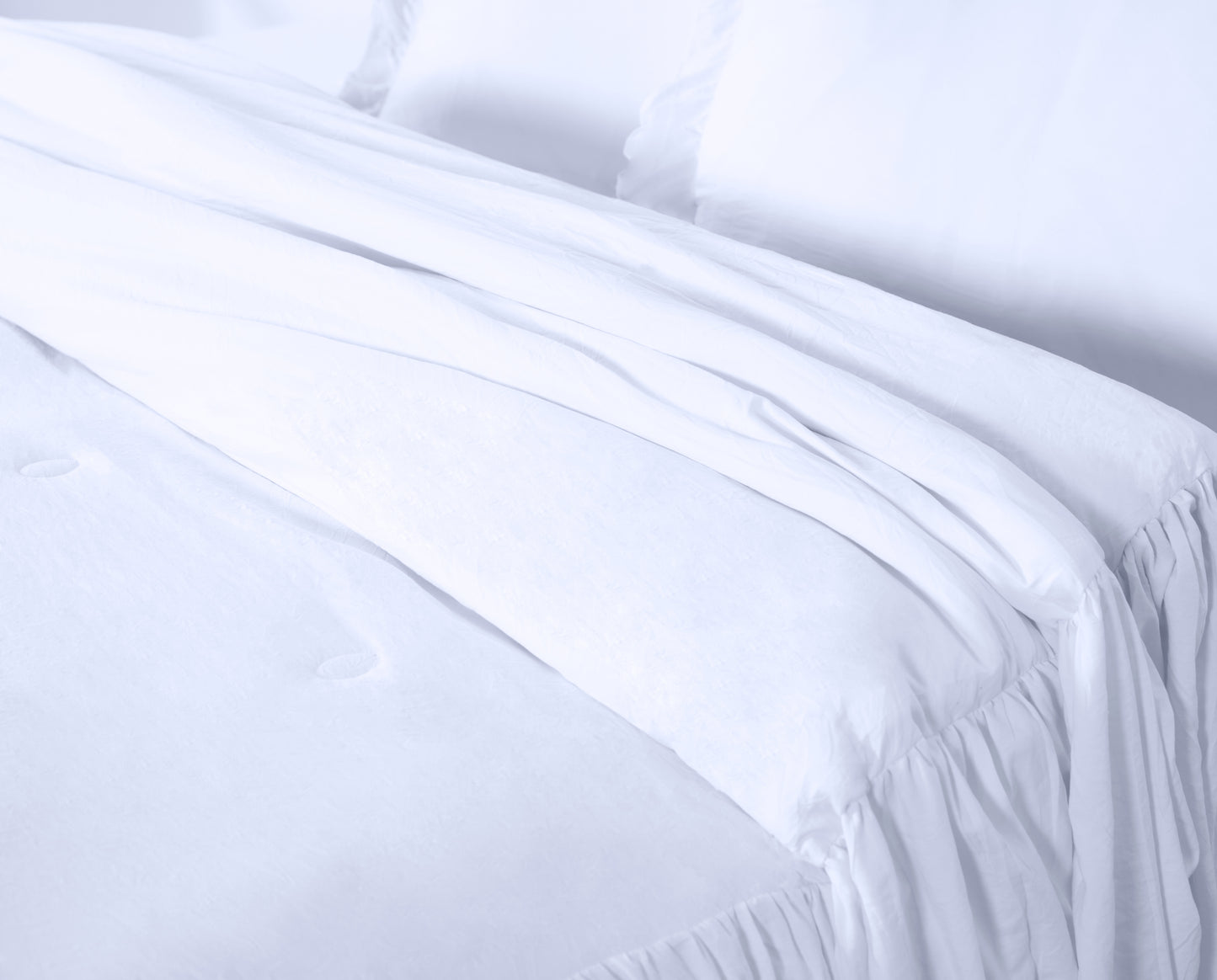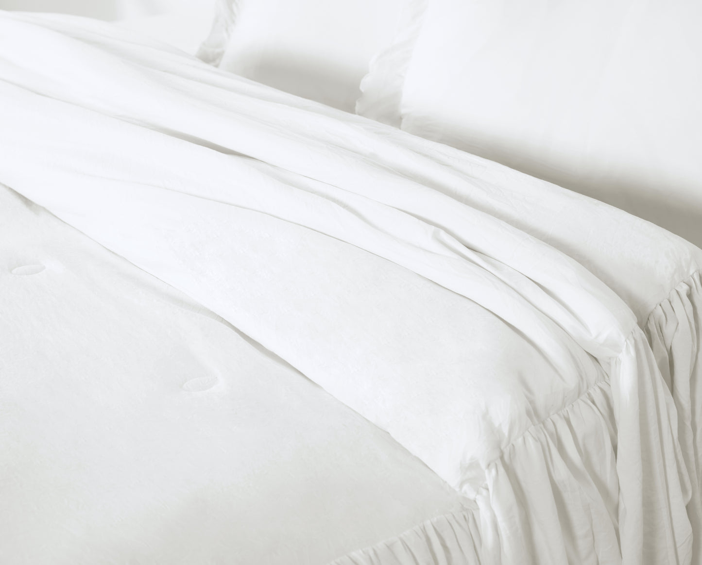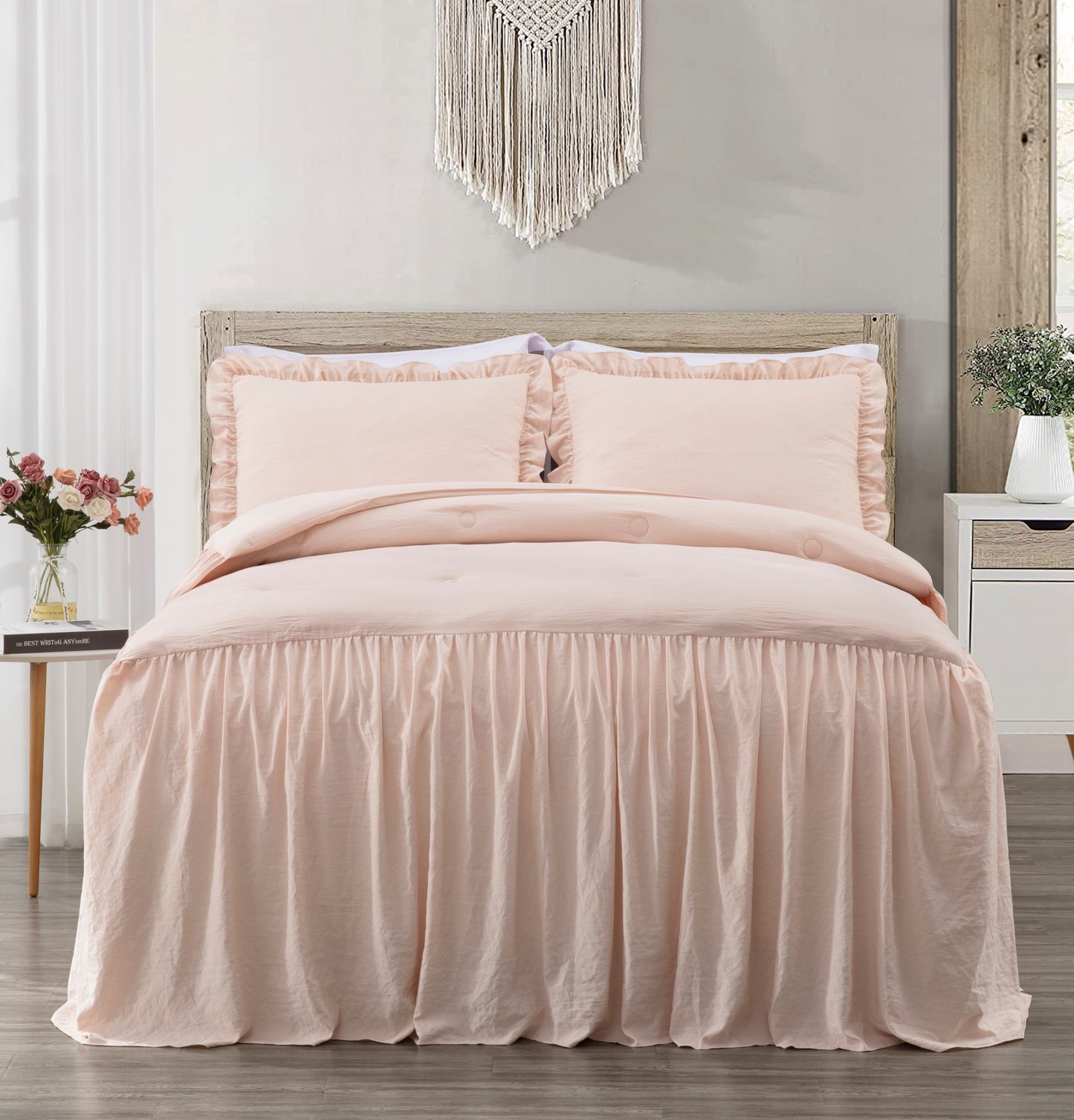 - Gorgeous and elegant feminine bedspread with a long ruffle skirt drop to add a perfect complement to a French Country farmhouse style bedroom décor