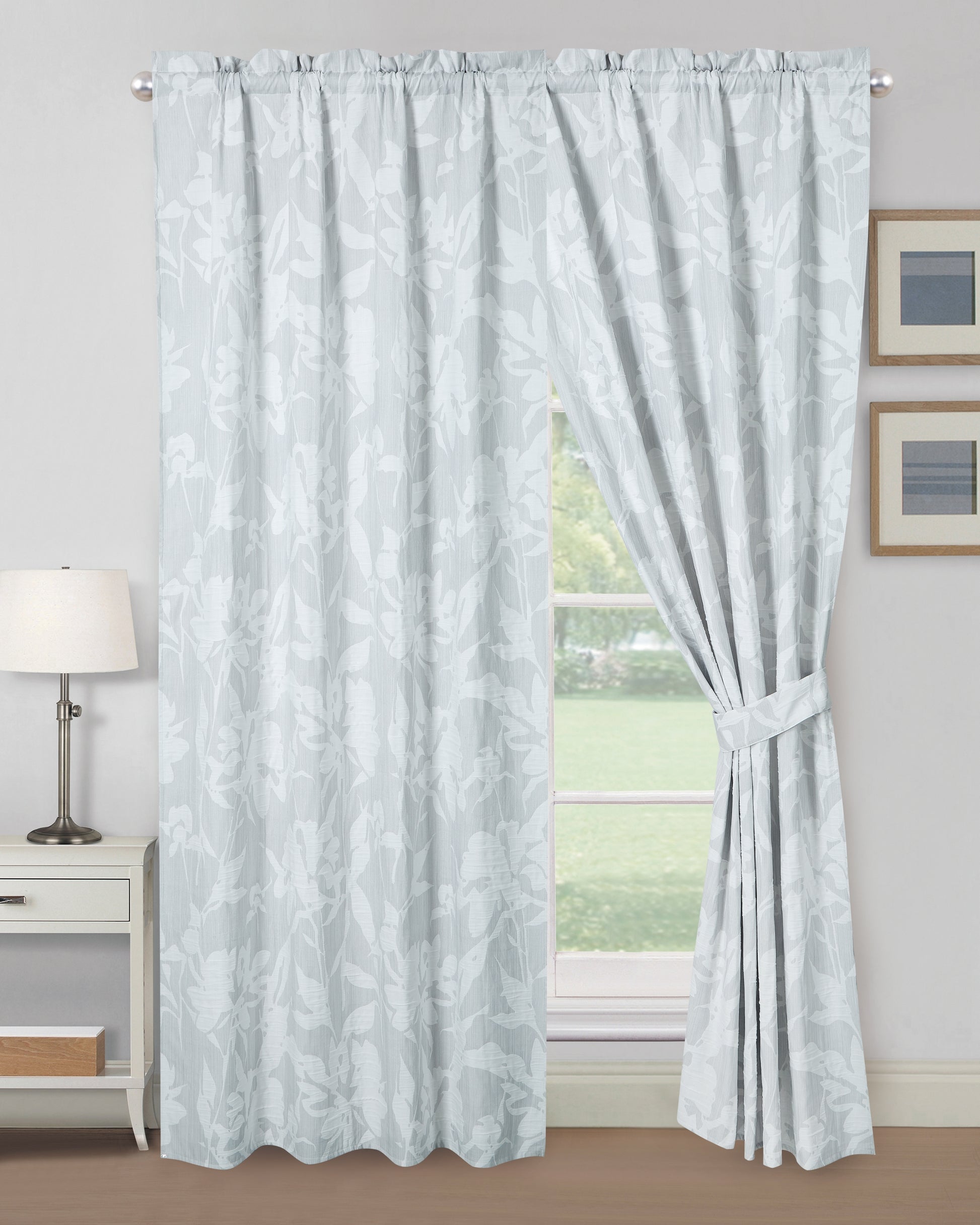 Transform your bedroom into a sanctuary of style and relaxation with this exquisite window treatment set. Crafted with meticulous attention to detail, the Floral Jacquard Woven Window Curtain Set boasts a stunning neutral gray and white color palette, adorned with a delicate floral botanical pattern that adds a touch of sophistication to any décor. The soft jacquard textured fabric offers a luxurious feel and is light filtering. These fashionable curtain panels are stylish to place anywhere in your home. Upgrade your space effortlessly with the timeless elegance of this window treatment.